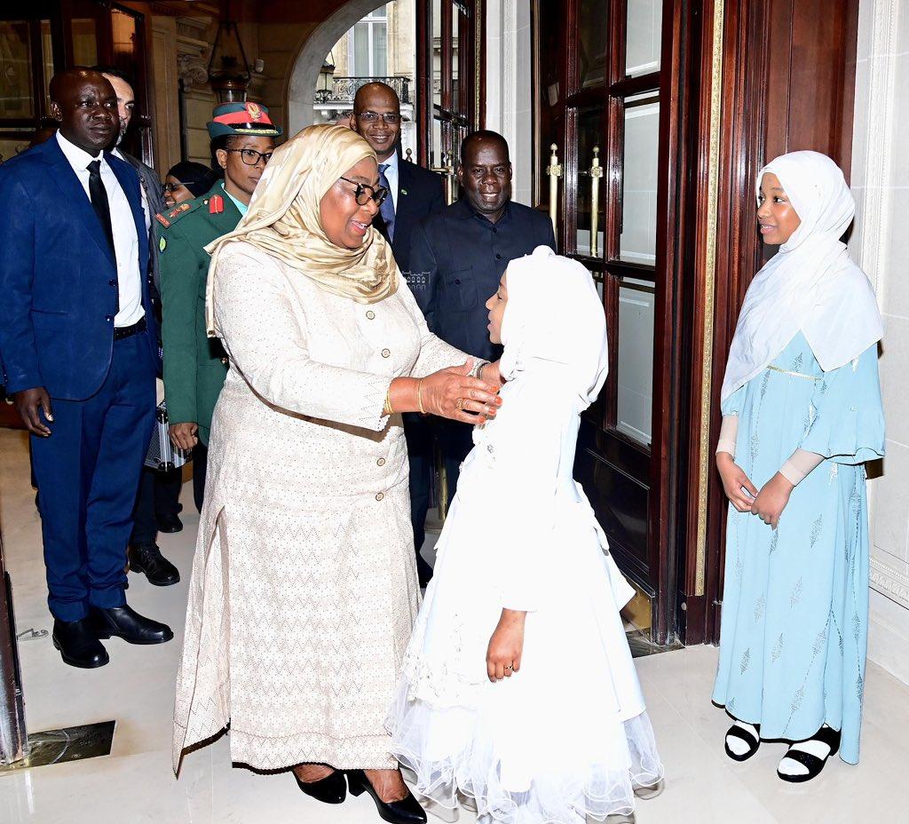 The President of the United Republic of Tanzania, Hon. Samia Suluhu Hassan, engaged in a conversation with the child Khaira Ali Jabir shortlyafter her arrival in Paris, France, to participate in the International Conference on Clean Energy Cooking on 12 May 2024.- 1