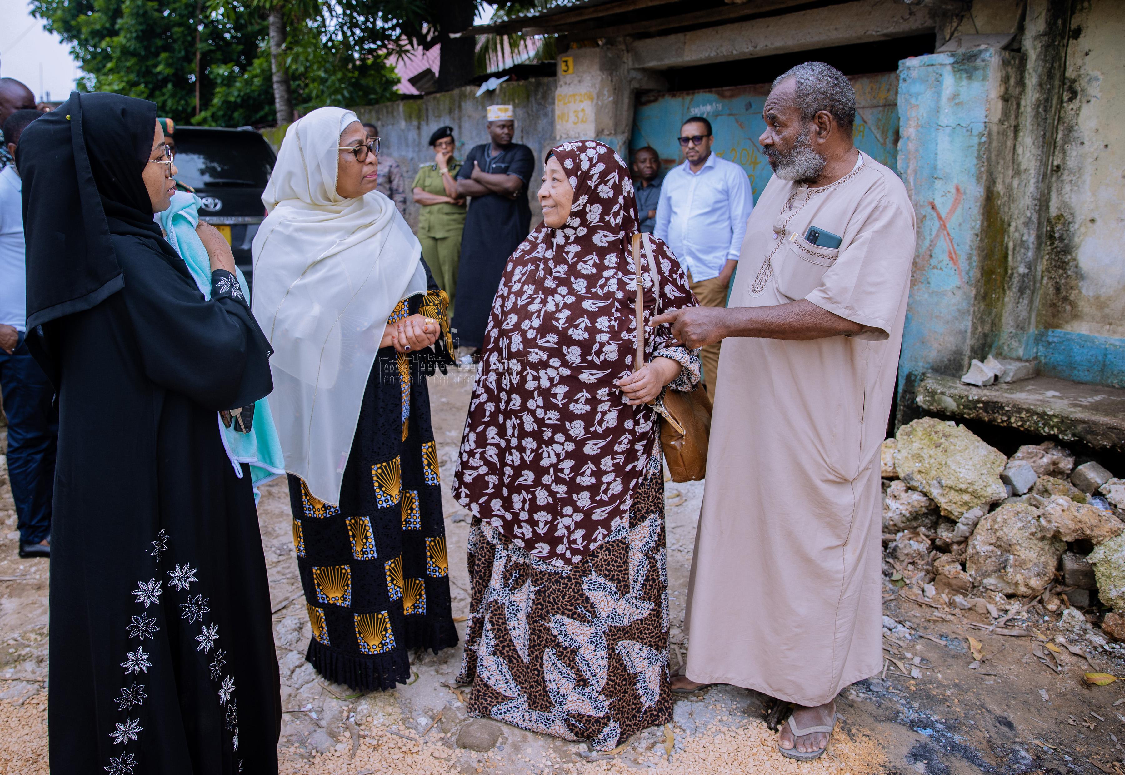 The President of the United Republic of Tanzania, Her Excellency Samia Suluhu Hassan, talking to her former neighbours,Mrs Asha Salum Abdallah, who both studied at primary and secondary school, and her husband, retired Police Inspector Rashid Zam Ali, with their daughter and grandson, when she visited Mombasa Street, Unguja Zanzibar, on April 15, 2024.- 1